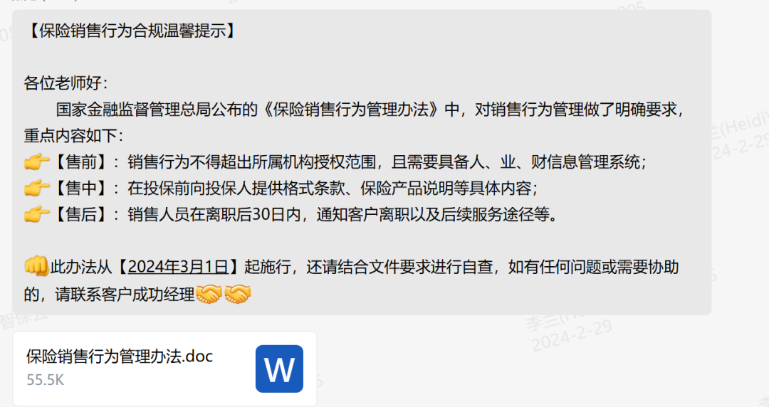 智保云一直以来都将客户服务系统的合规管理置于首位,并积极响应国家金融监督管理总局的号召。我们对《办法》进行了全面细致的解读,涵盖售前、售中、售后等全业务流程,形成了合规问答执行建议及相关业务文件参考模板,如《合作终止书面承诺书》等,并同步分享至智保云客户群,为诸多客户节约了制度解读及配套文件输出的时间。
