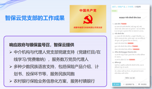 此外,在中央政策的引领下,智保云也充分发挥创新性和服务意识,推进平台的少数民族多语言版本建设,支持少数民族地区的保险中介机构展业和后台管理系统,并提供党建栏目在线学习和党费缴纳,配合少数民族各相关属地机构,落实中央政策及乡村振兴工作,也将提供对农村信用合作社、农村商业银行、村镇银行的保险兼业代理软件系统,合规高效开展保险业务,全面提升中介机构对人、财、业的信息化管理水平,也便于展业人员在田间地头开展保险服务工作。